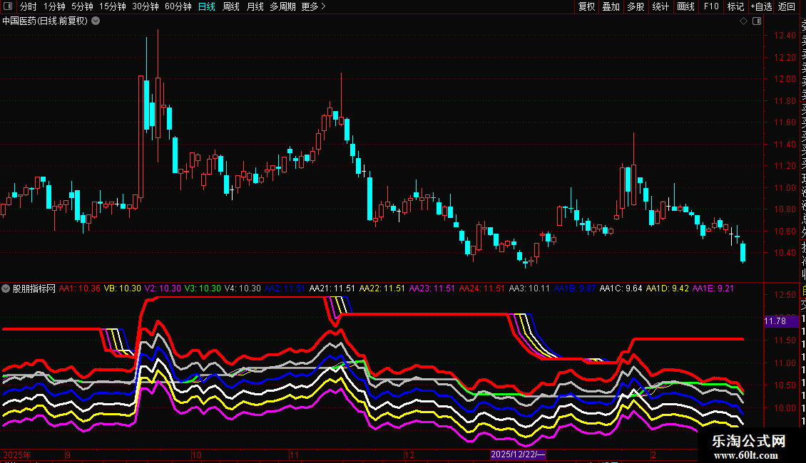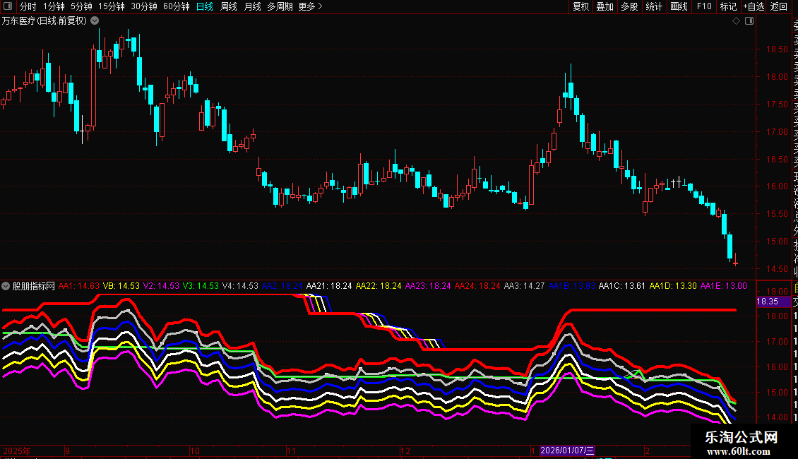 AA1:(2*CLOSE+HIGH+LOW)/4,COLORRED,LINETHICK4; VB:LLV(LOW,21),LINETHICK1;V2:LLV(LOW,20),LINETHICK1;V3:LLV(LOW,19),LINETHICK3;V4:LLV(LOW,18),LINETHICK1;