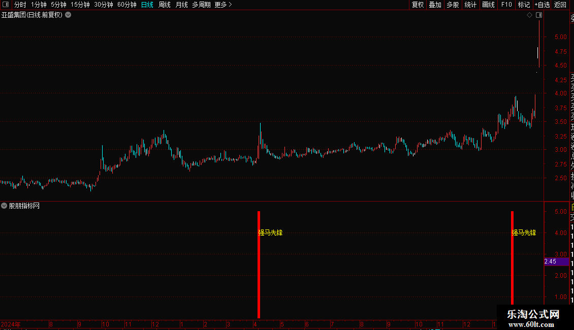 在满足条件的K线位置,绘制红色柱状图标,并标注“强马先锋”文字提示。