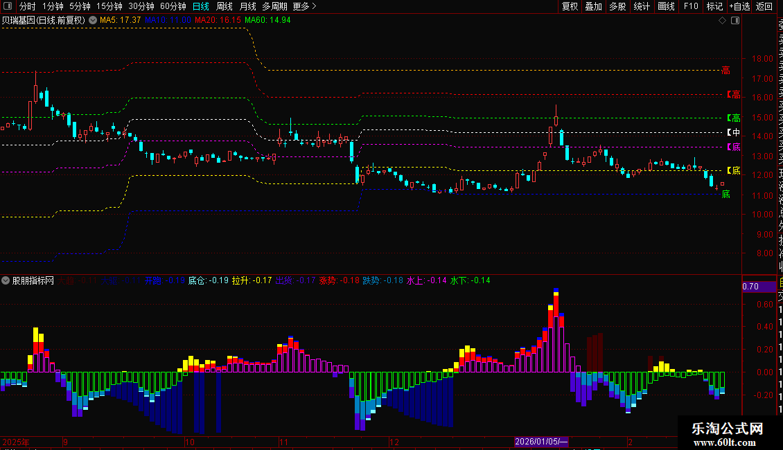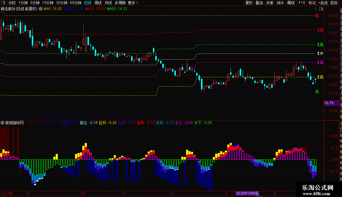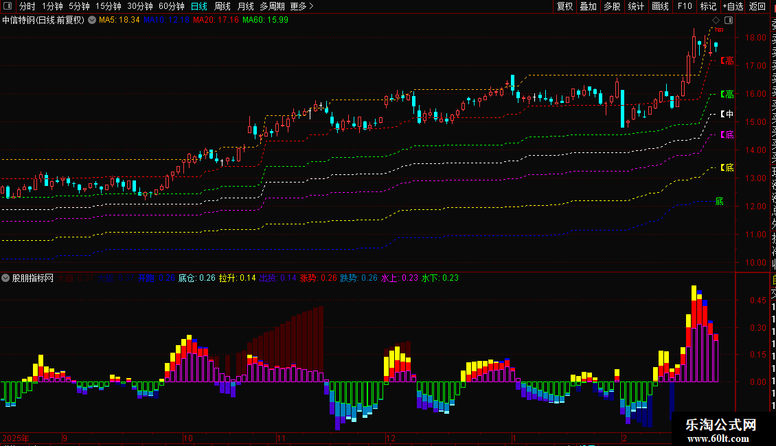 副图(趋势):不同于传统的单一MACD,它叠加了5组不同参数的MACD柱状图(从超长线到短线),通过不同颜色和粗细的柱体,直观展示从大趋势到小波段的多空力量变化。