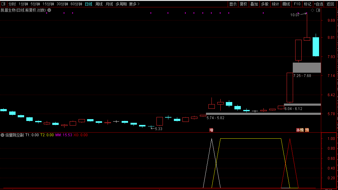 关于横盘震荡的时间,指标设定要求震荡时长在3天以上,其中震荡周期保持5到10天是最佳状态,符合这个周期的倍量跳空缺口不补形态,后续走势参考性更强,也是优质的短线选股指标参考信号。