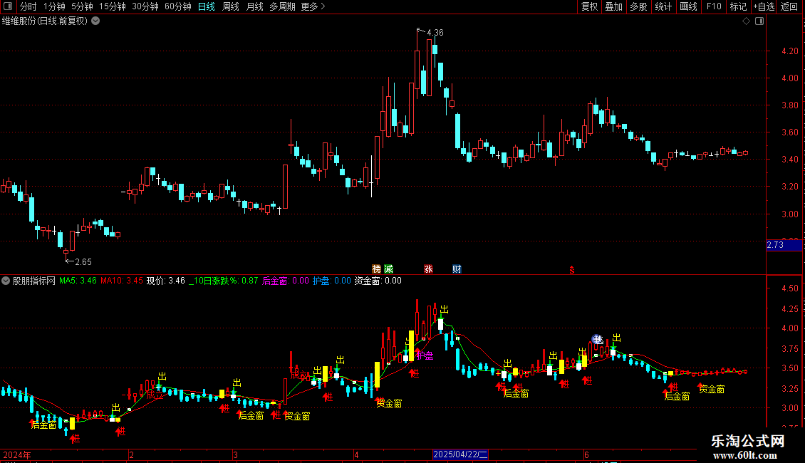 2. 核心买卖信号:通过“给”与“力”两条自定义均线的交叉(金叉/死叉),在K线图上直接标注“进”、“出”文字和图标信号。