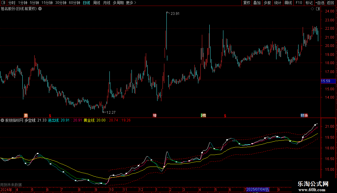 多空线和进出线通过特定算法计算,并依据其方向变化(连续5个周期向上或向下)来变色,直观显示短期多空状态和中期进出场信号。