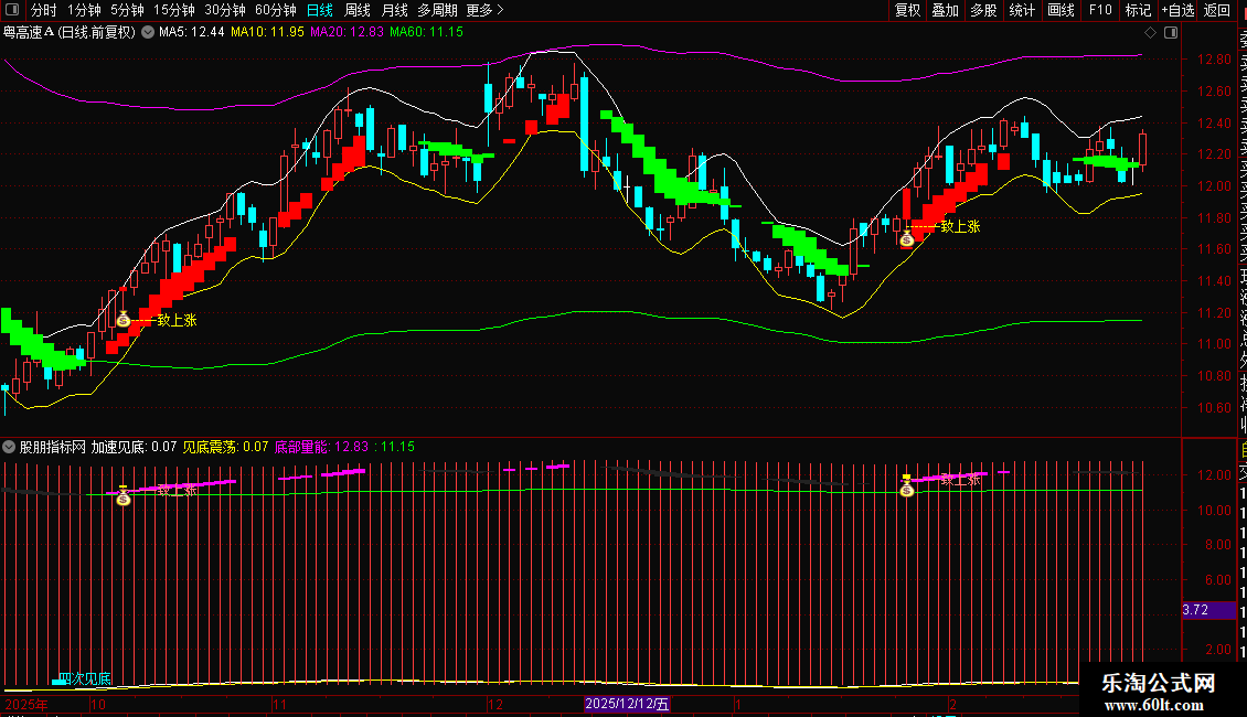 本套“底部形态”指标包含主图、副图、三个关联公式,核心基于改良版MACD逻辑,结合均线角度、量能等维度,精准识别股价底部震荡、吸筹到即将拉升的完整过程。主图指标标注启动区间、均线趋势及“一致上涨”信号,副图指标量化见底次数(1-9次),从“进入底部”到“即将拉升”分步提示,公式则直接筛选6-9次见底的高拉升潜力个股。