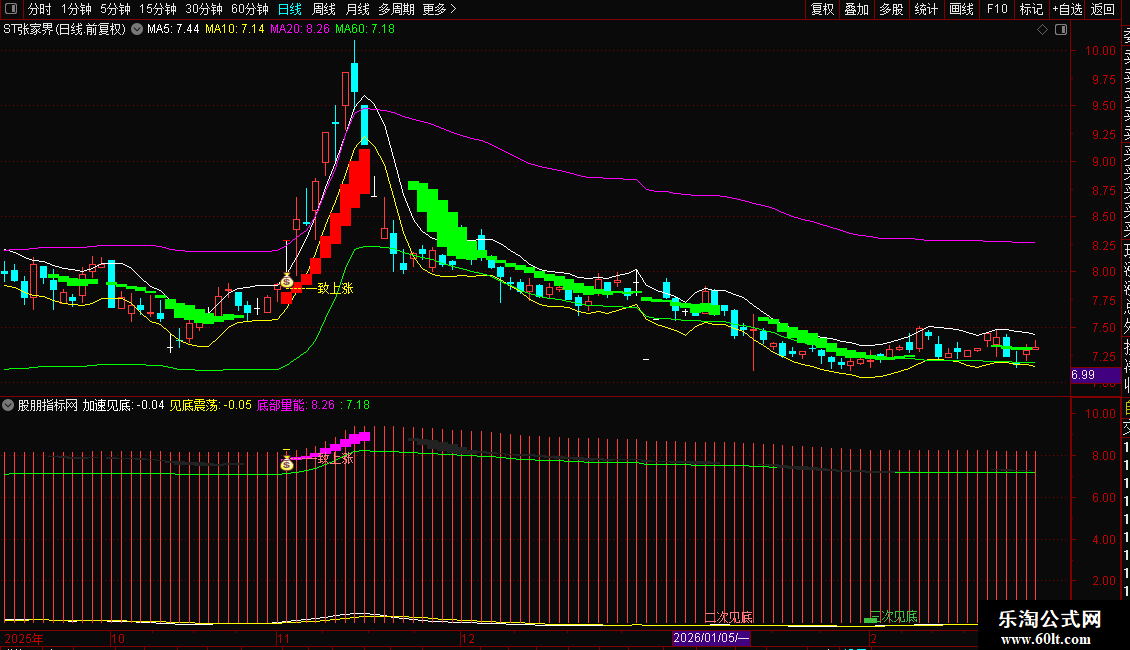 2. 副图指标:关注彩色柱体标注的见底次数,“六次见底”提示底部震荡,“八次九次见底”伴随“底部吸筹/即将拉升”文字,是关键加仓信号;