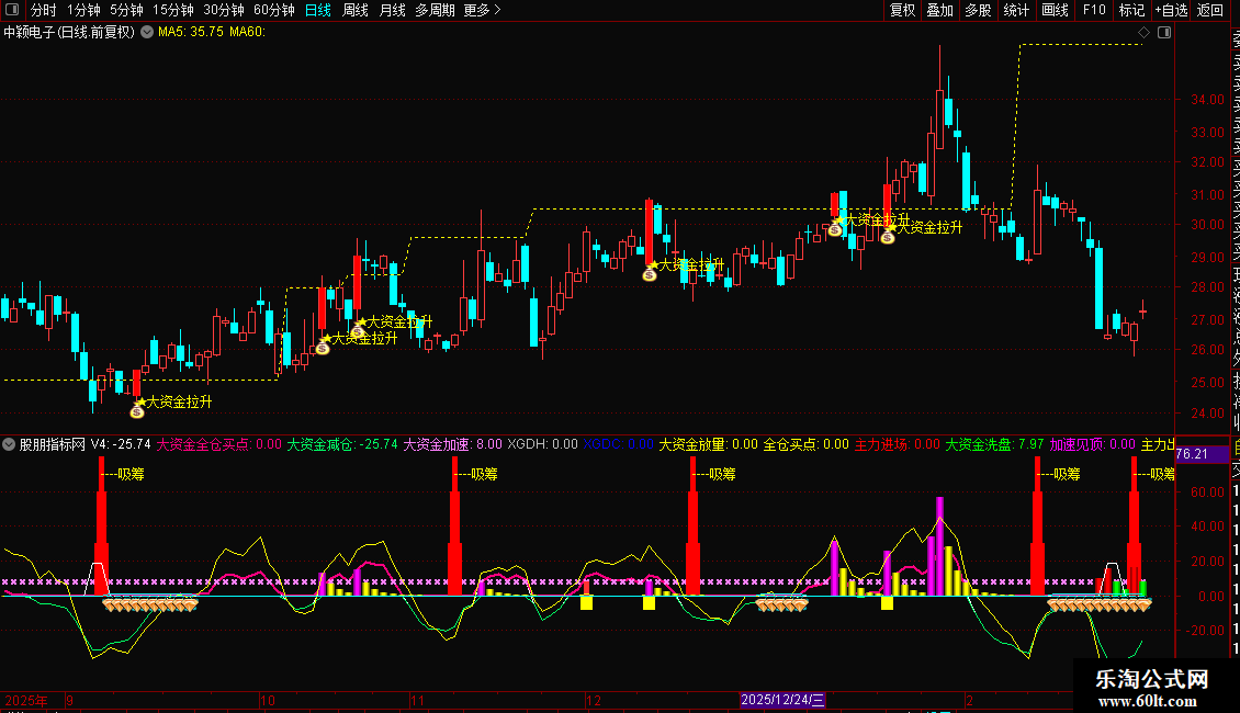 3. 主图出现“大资金拉升”信号,同时幅图代表大资金强度的紫色趋势线同步向上共振拉升,表明主升浪行情启动。