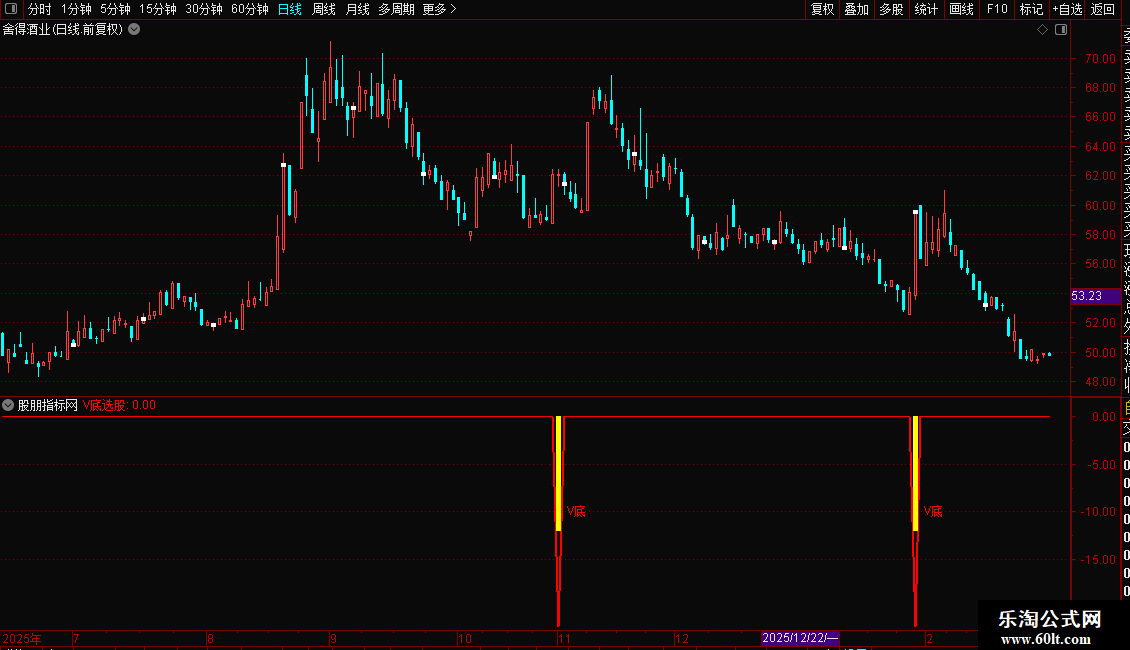 当指标在图表上出现“V底”文字及黄色柱状提示时,意味着可能的V型底部已经形成。这通常预示着下跌趋势结束,新的上涨趋势即将开始。投资者可将其作为中短线的买入参考信号,结合成交量等其他因素综合判断,以把握潜在的反弹或反转行情。