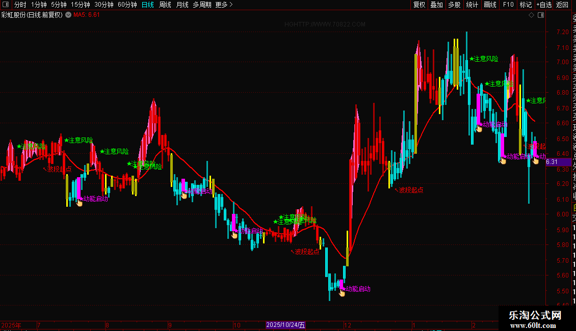 动能启动:当K线底部出现紫色“★动能启动”图标及文字时,代表短期下跌动能衰竭,股价可能迎来爆发,是短线介入的良机。