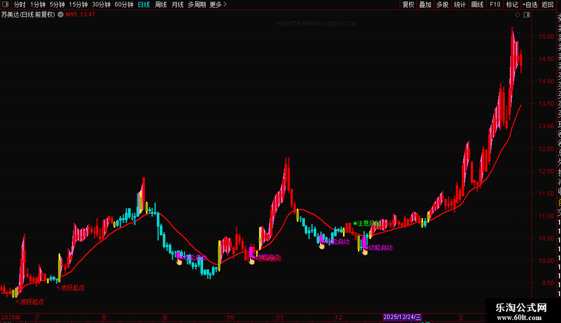波段起爆:当K线底部出现红色“↖波段起点”文字提示时,意味着经过调整后新一轮波段上涨开始,适合中线布局。