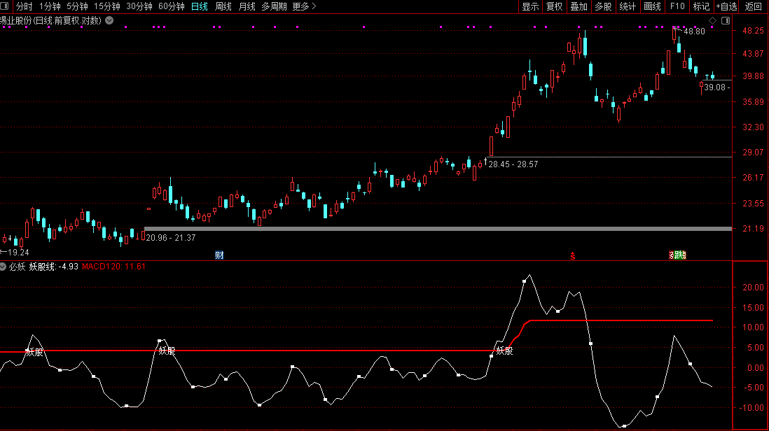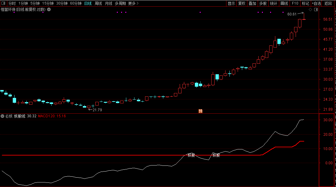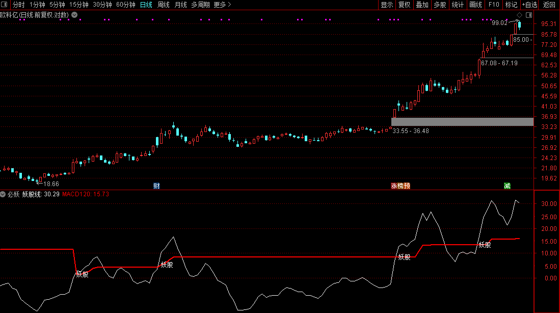 当妖股线上穿MACD120时,出现“妖股”文字提示