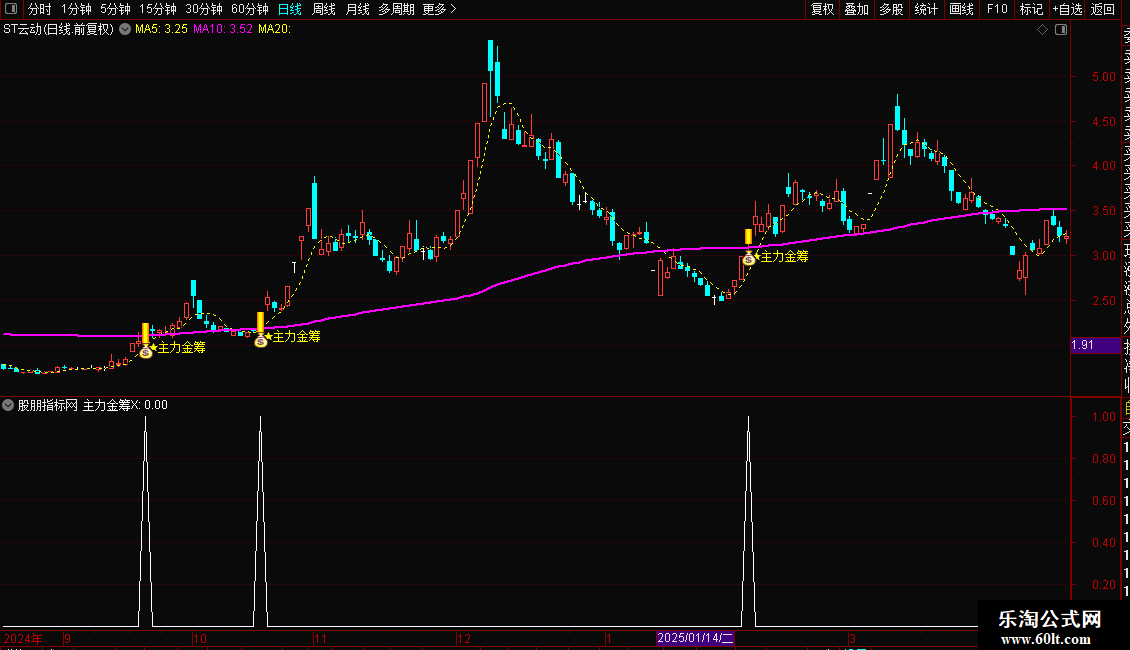 1. 主图公式:导入通达信主图指标后,金筹线(COLORFF00FF)为核心参考位,当个股均线呈多头排列(MA10>MA20>MA60),且股价涨停突破金筹线时,出现的彩色涨停柱和星星提示为买入信号;