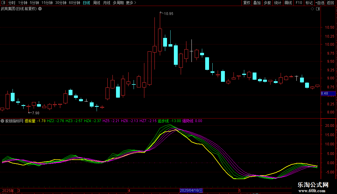 2. 趋势信号:对ROC进行多重指数平滑(EMA),生成多条平滑曲线(HZ1至HZ7),用于识别和确认动量趋势的强弱与方向转换。