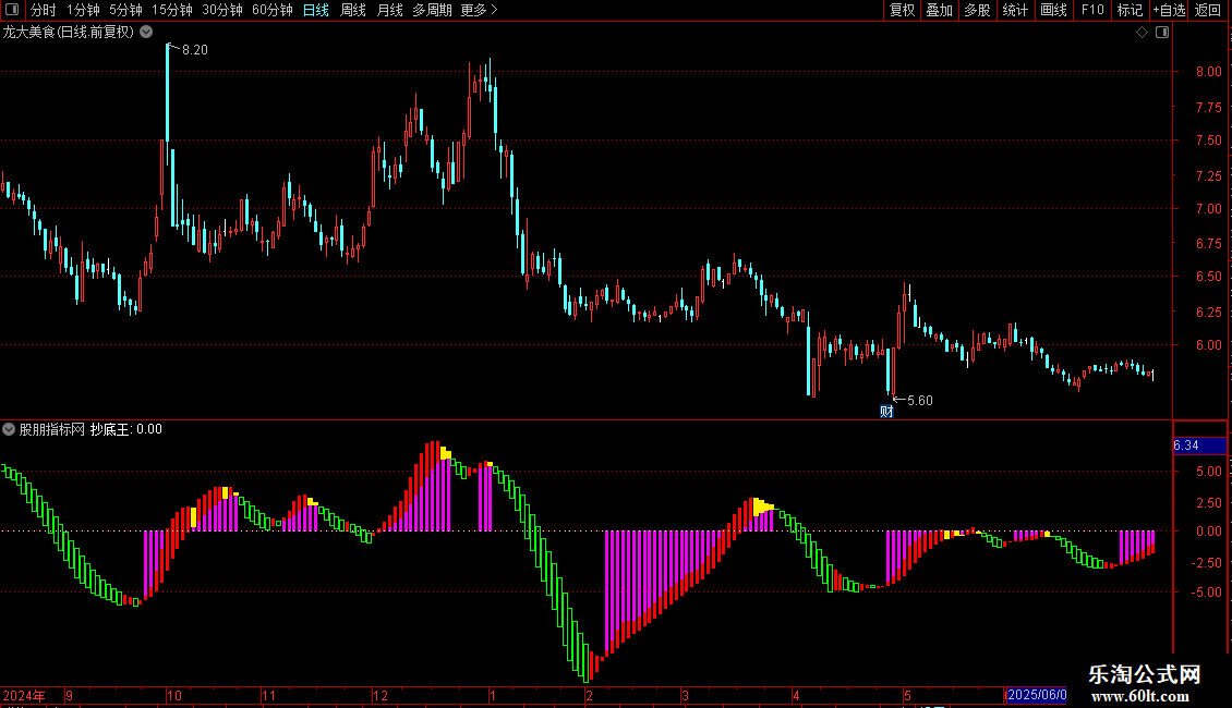 指标通过多组均线、价格偏离度及成交量分析,识别趋势状态与底部信号。主图以柱状线区分“持股”、“持币”、“反转”、“洗盘”四种状态,并设有“抄底王”文字标记,提示潜在底部反弹机会。适用于中短线趋势跟踪与超跌反弹捕捉。