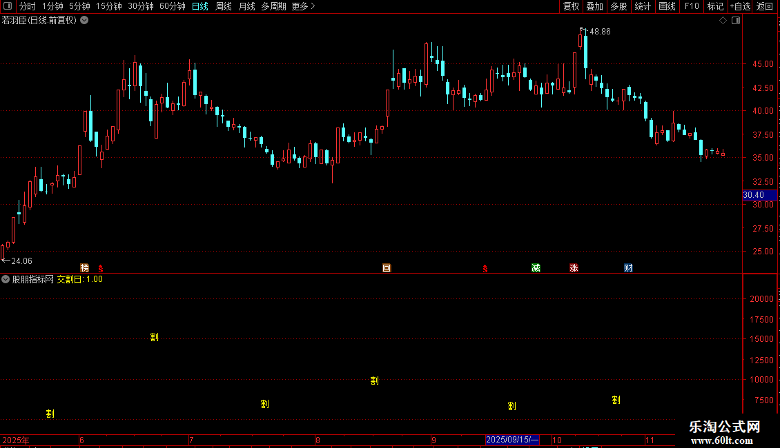 在日线周期下,当满足当月第三个周五的条件时,在成交量上方标记“割”字,提示交割日。