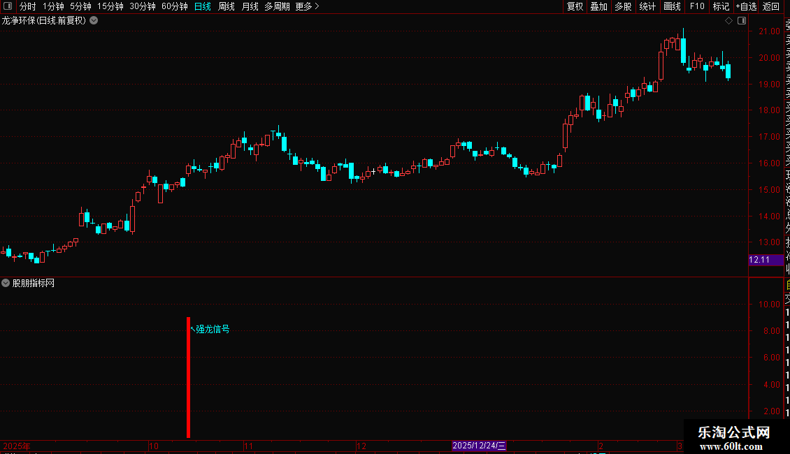 公式原理:通过20/60日均线判断股价趋势,结合股价涨幅(≥3%)、冲高回落幅度(<1%)等条件筛选强势个股;同时计算21周期高低价均线、20日均线标准差等数据,通过角度函数(ATAN)判断均线上升斜率(>75°),最终触发“强龙信号”和“双轨擒龙”信号。