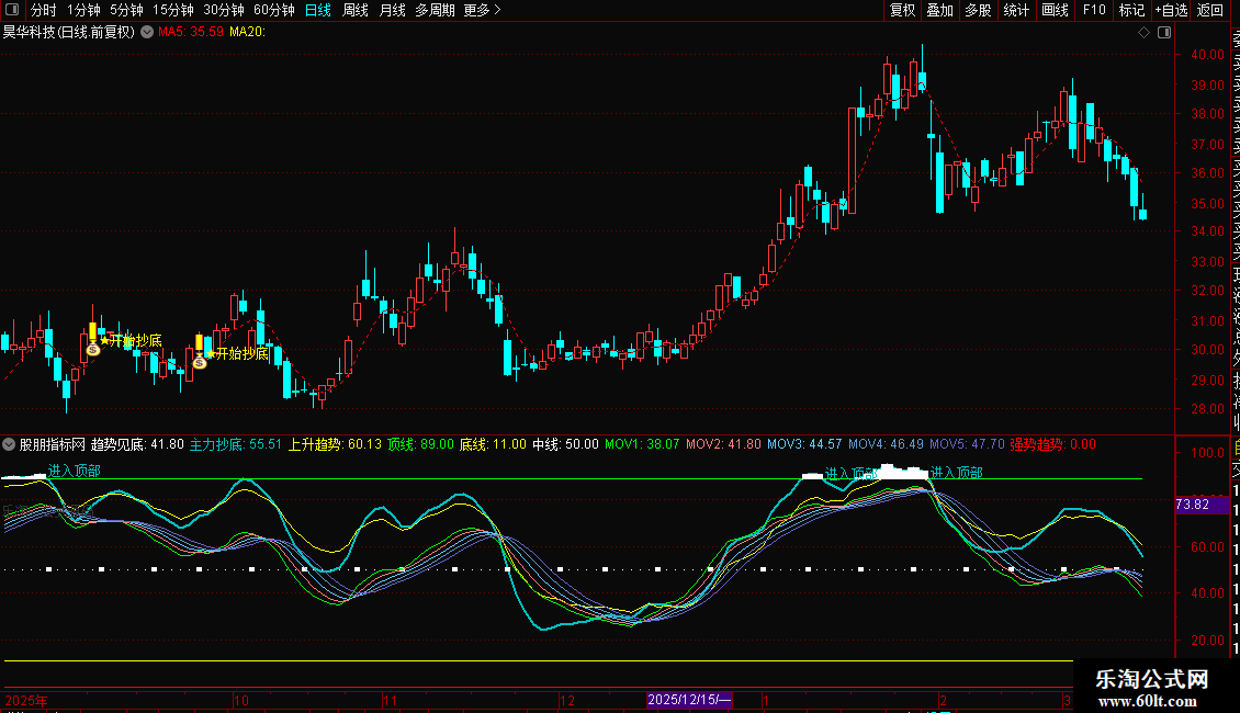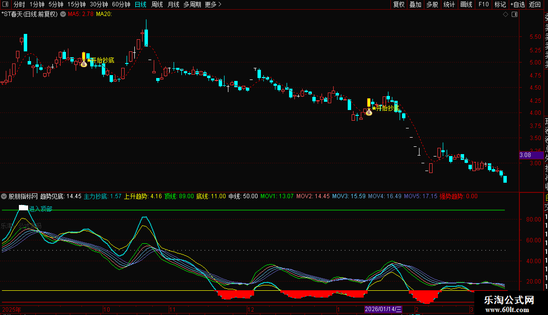 1. **主图指标**:以5日均线为基础,结合EMA均线差值和价格震荡因子(DD),满足多条件共振时,会在K线标注黄色柱体、“★开始抄底”文字及买入图标,直观提示抄底信号。