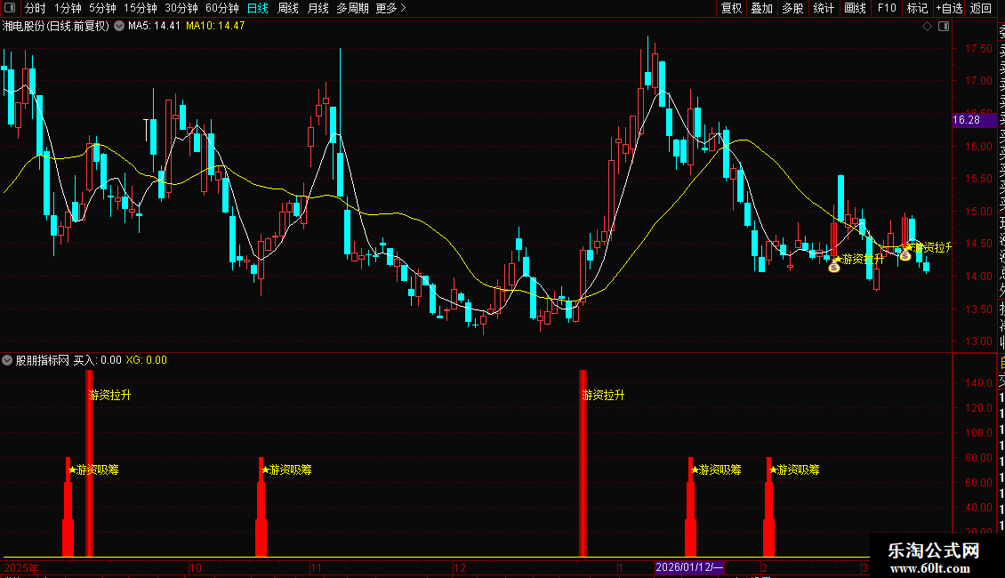 4. 游资低位吸筹布局确认后,主图幅图出现游资拉升共振信号,代表进入连板加速行情