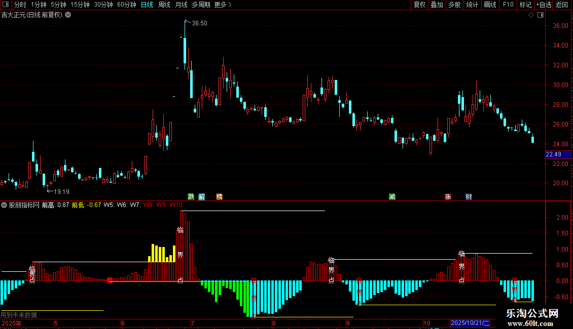观察MACD柱状线与“前高”、“前低”趋势线的相对位置。当红色柱体突破白色“前高”线时,可能预示上涨动能增强;当青色柱体跌破黄色“前低”线时,可能预示下跌动能加强。同时关注“临”、“界”、“点”的文字提示位置,它们标识了潜在的阻力或支撑临界区域。