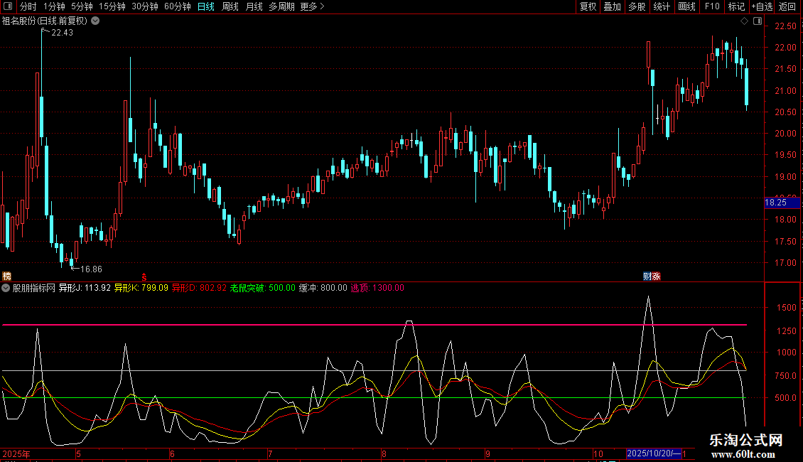 指标结合了筹码分布、KDJ及价格区间,通过异形J、K、D三条线进行动态分析。异形J线为核心波动线,异形K线为短期趋势线,异形D线为长期趋势线。老鼠突破、缓冲、逃顶为三条水平参考线,用于识别关键突破位与风险区域。指标旨在捕捉价格在筹码与动能共同作用下的趋势转折点。