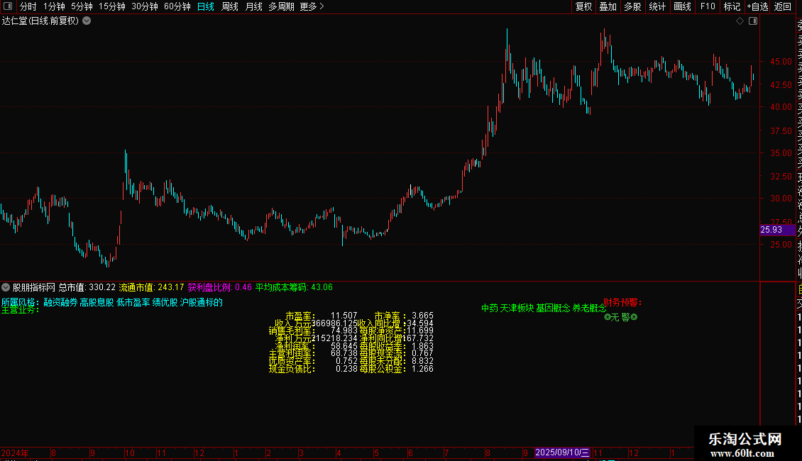 指标是一个全面的基本面信息面板,直接在K线图上展示个股的所属板块、主营业务、市值规模及获利盘比例。核心功能是进行财务健康度诊断,通过计算Z值模型自动预警财务风险(重警、轻警或无警)。同时,它详细列出了市盈率、毛利率、净利润增长率、每股现金流等关键估值与成长指标。操作策略上,投资者可利用此面板快速筛选低估值、高成长且财务安全的标的,避开有财务预警的风险股,辅助价值投资决策。
