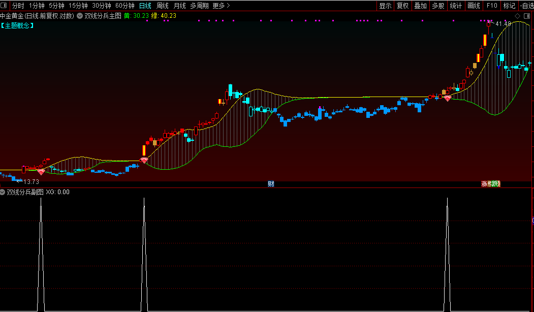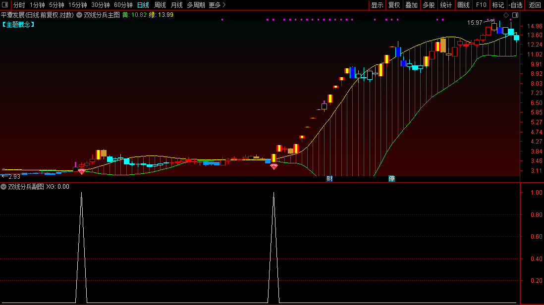通达信【双线分兵】副图/选股识别股价区间突破信号来捕捉强势启动源码