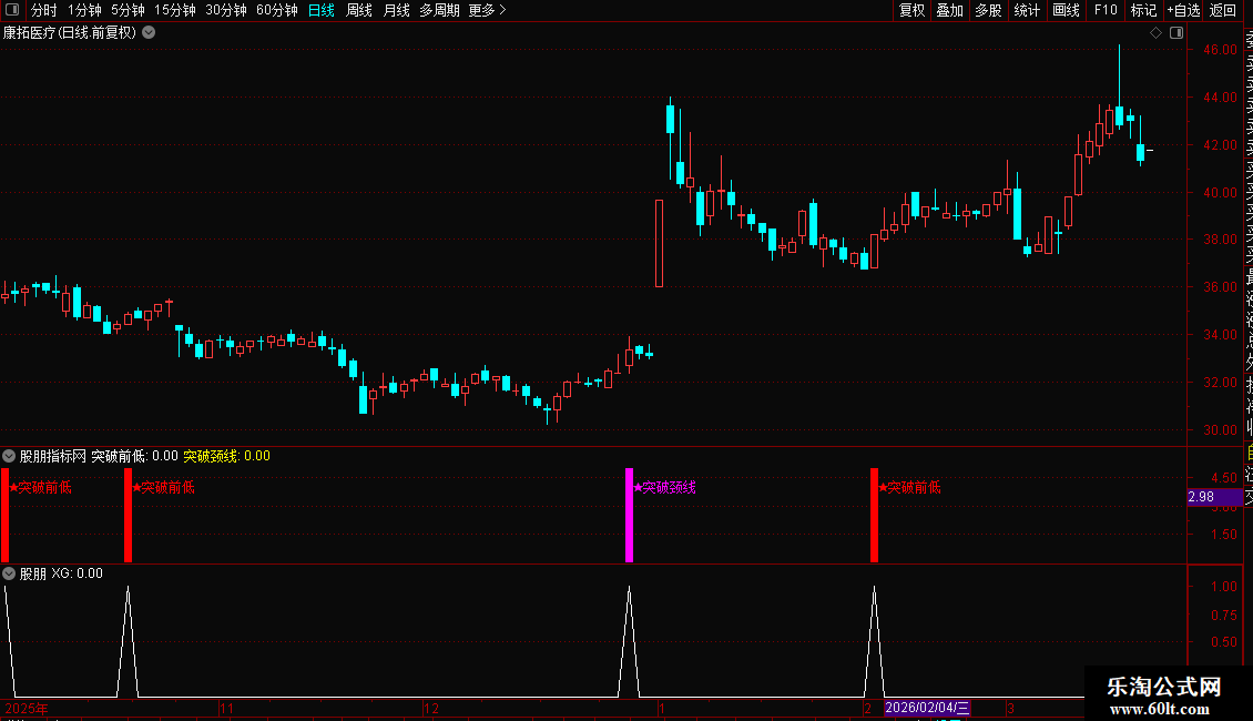 指标专门用于捕捉“黄金坑”形态后的突破买点。其核心逻辑是寻找股价在短期内急跌挖坑,随后企稳并重新站上关键压力位的走势。主要功能识别两种强势信号:一是股价放量突破前期低点形成的坑底压力,确认洗盘结束;二是股价突破颈线位,确立双底或头肩底形态完成。操作策略上,当副图出现红色柱体及“突破前低”文字时,可视为激进建仓点;出现紫色柱体及“突破颈线”文字时,为趋势确认的稳健加仓点,适合短线博弈主升浪。