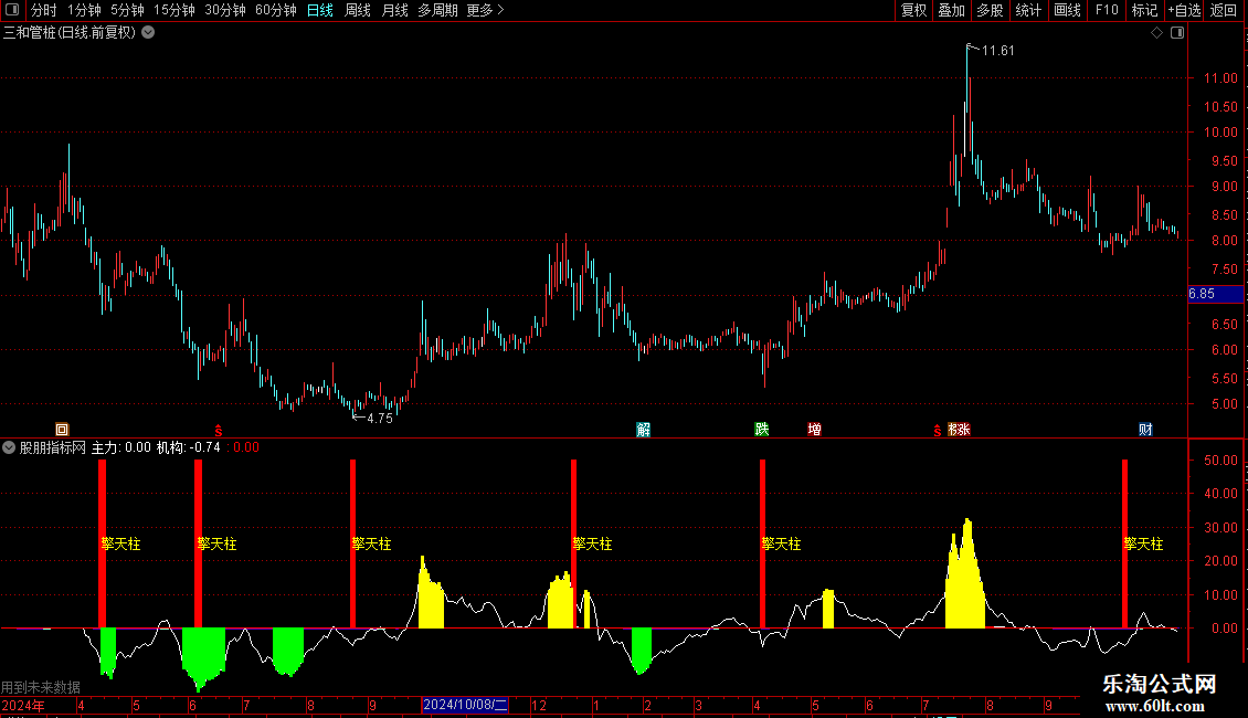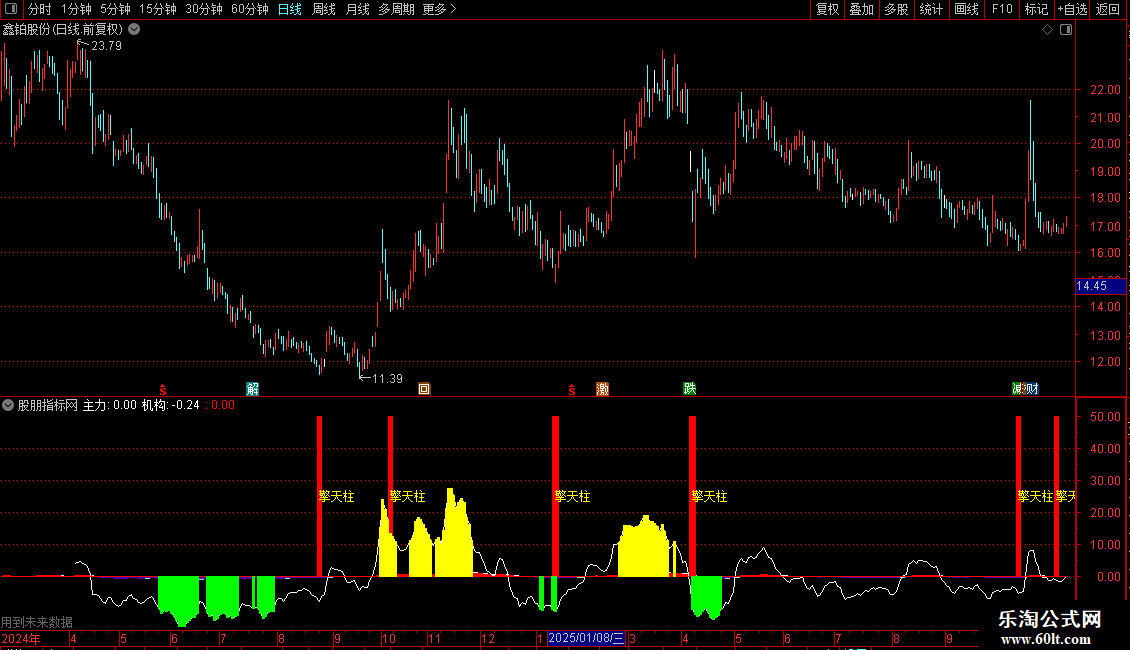 机构线:围绕零轴波动。当其为较大正值(黄色柱)时,表示股价强势,机构可能做多;当其为较大负值(绿色柱)时,表示股价弱势,机构可能做空或观望。