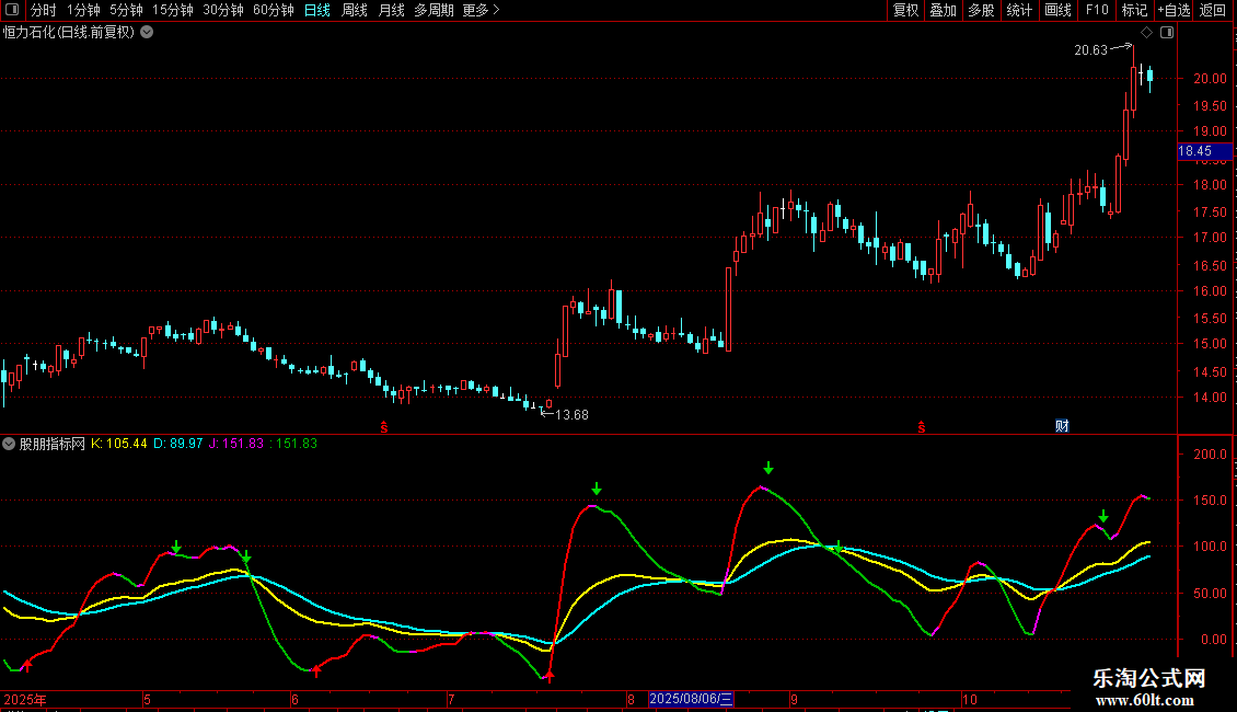 指标基于价格均值与标准差构建,通过计算K、D、J三条曲线分析价格偏离与动量变化。K线反映价格偏离均值的程度,D线为K线的平滑,J线为两者的差值。指标通过颜色区分J线涨跌,并在特定条件满足时显示买入或卖出图标。