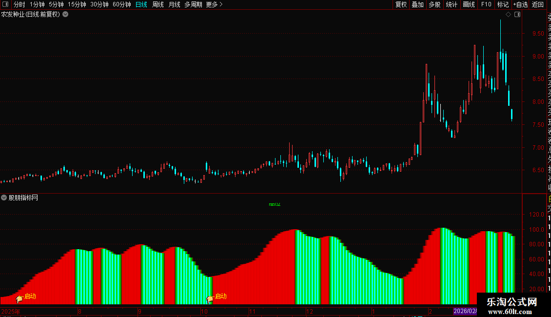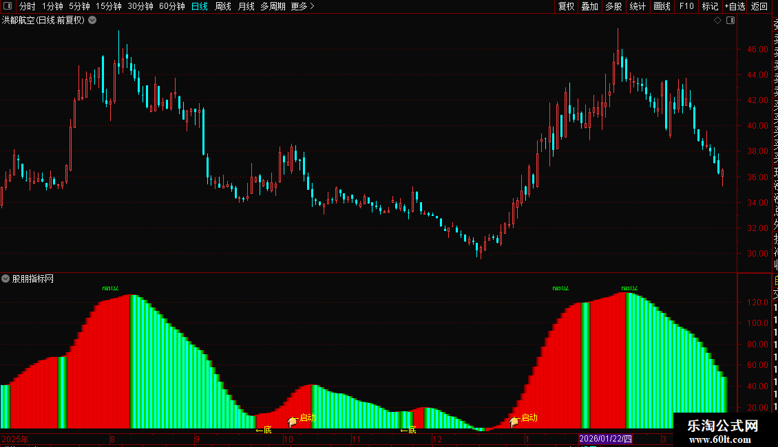 指标是一个综合性的趋势与买卖点提示系统。主要功能是通过多重均线、波动率及资金流向算法,判断股价所处的相对高低位及趋势强弱。操作策略上,当出现彩色柱状体由绿转红或数值上升时,代表多头动能增强,可视为持股或买入信号;当柱状体转绿或数值下降,提示风险增加应考虑减仓。此外,指标会在超跌区域提示“底”部机会,在均线金叉且处于低位时提示“启动”信号,辅助投资者捕捉趋势反转点。
