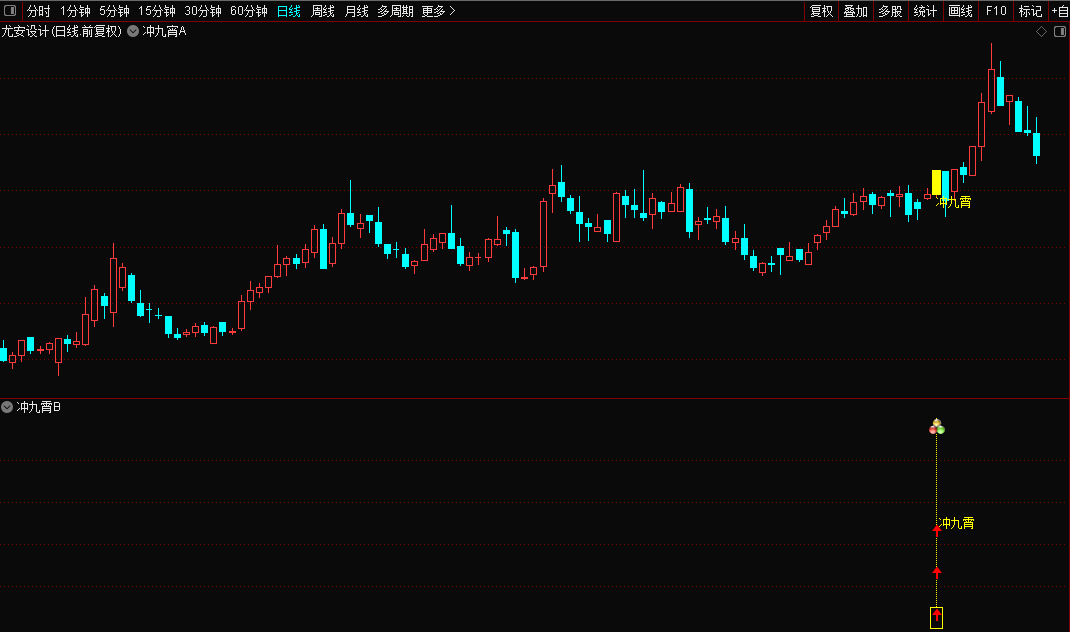 主图公式黄色柱状线及"冲九霄"文字信号。