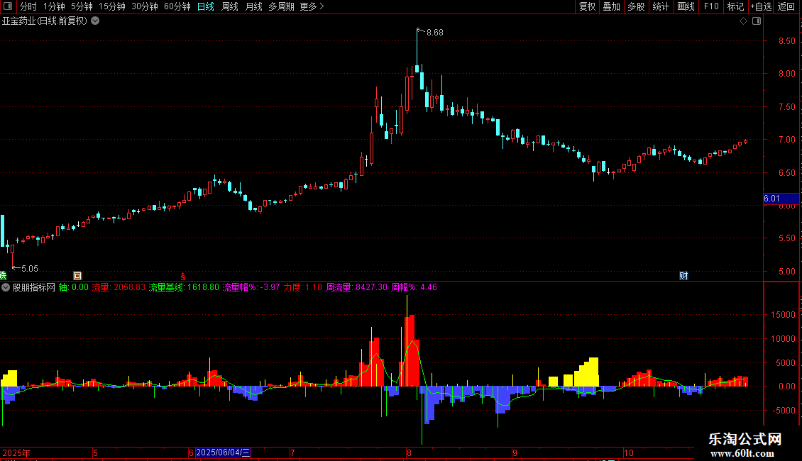 - 观察“流量”柱状图与“流量基线”的关系,判断资金趋势。