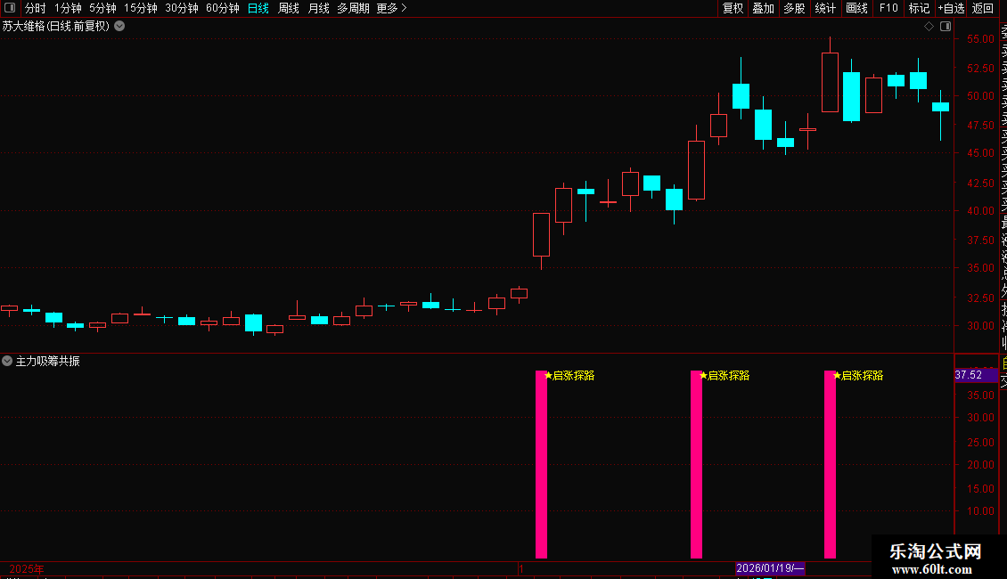 当所有条件同时满足时,指标会在副图位置(约40刻度处)绘制紫色柱状线,并标注“★启涨探路”的黄色文字提示。