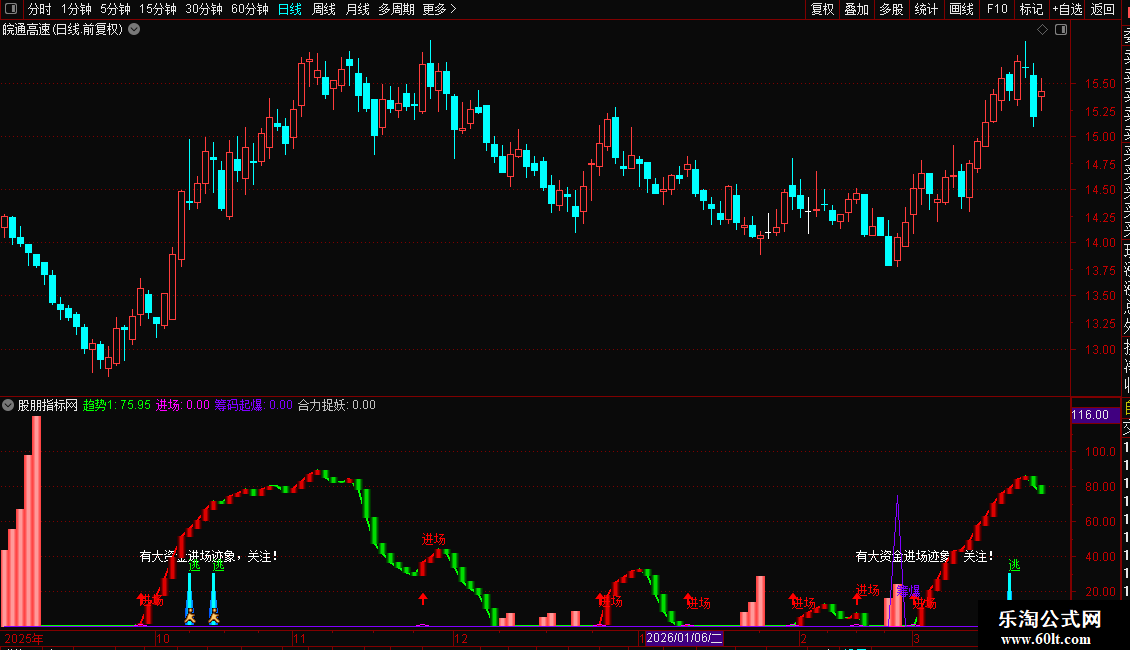 2. 进场时机:指标显示“进场”红色文字+向上箭头,且“趋势1”由绿转红时,为潜伏良机;“有大资金进场迹象”提示资金异动,需跟踪量能是否持续放大。