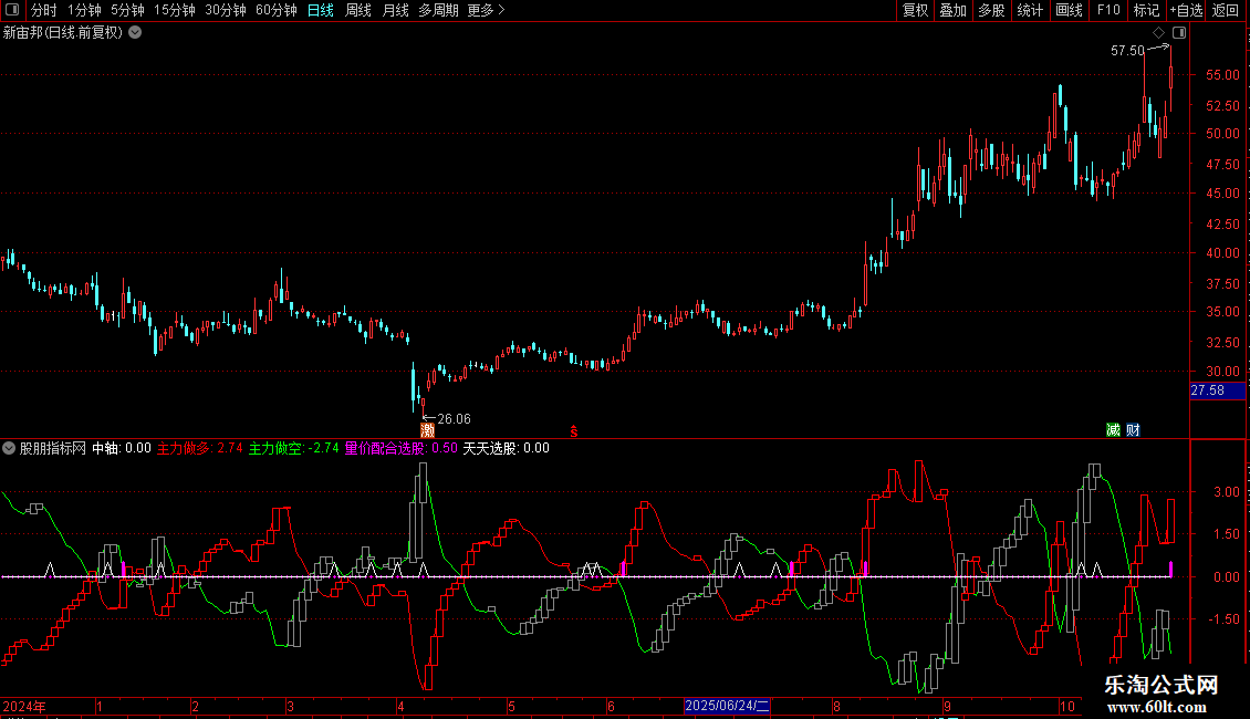 副图区域会显示“量价配合选股”和“天天选股”两个信号点。当出现彩色柱或信号点时,表示对应的选股条件被触发。