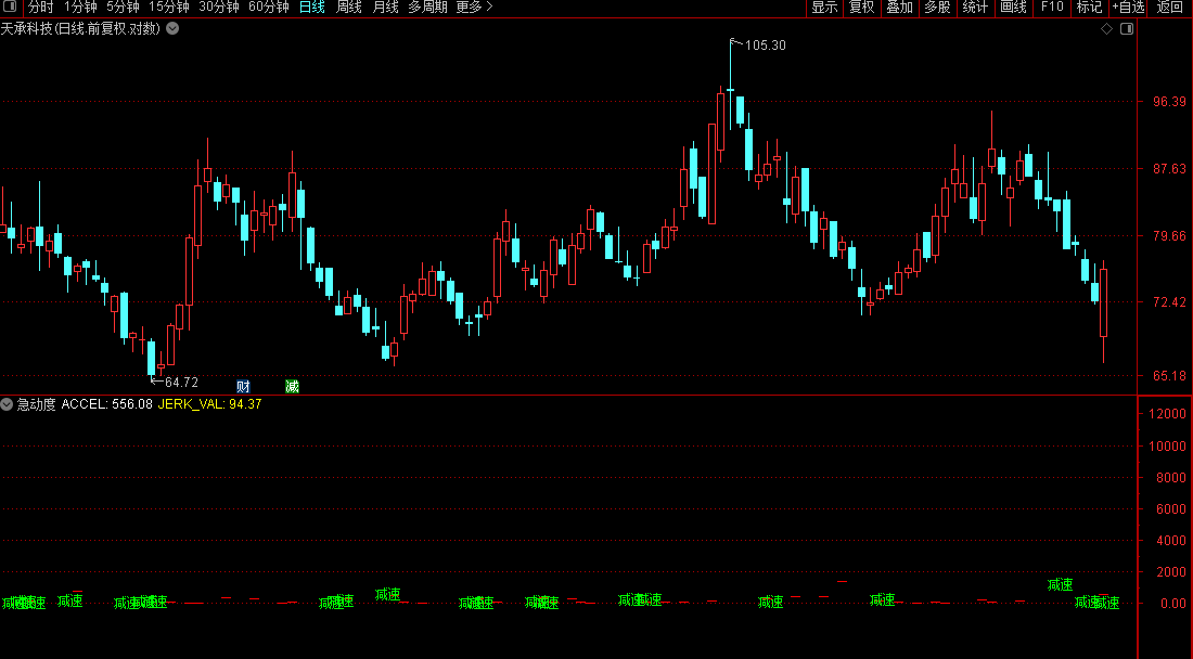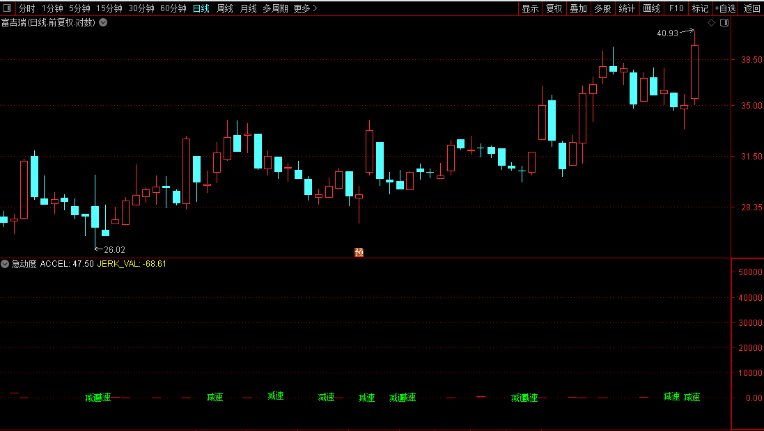 主力操盘不是 “一下子涨 / 跌”,而是 “先慢慢加速,再减速,最后反转”—— 急动度能捕捉到这个 “动力变化” 的过程,让你看懂主力是在 “真拉升” 还是 “诱多”,这是普通指标做不到的。