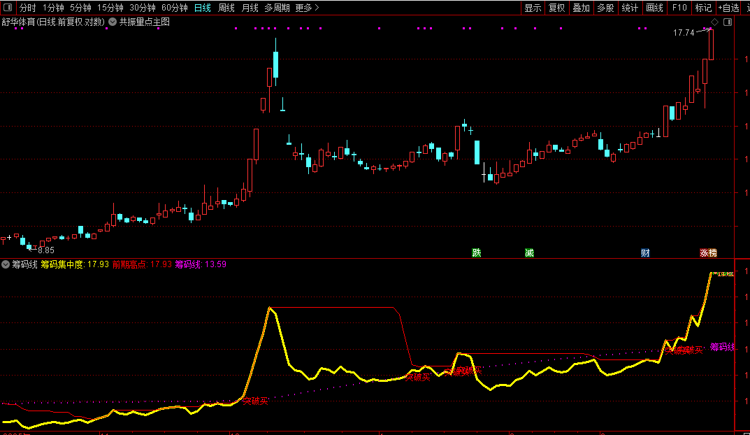 突破买点:当黄色“筹码集中度”线上穿紫色“筹码线”时,提示“突破买”,预示主力拉升启动。