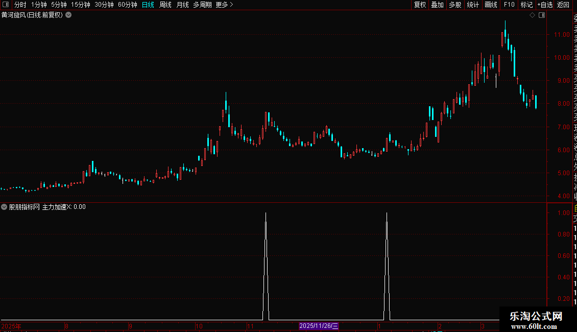 主力加速X:crOSS((XG13>XG14 AND XG9>XG11 AND XG8>REF(XG8,1)),0.5) AND XG6>XG7 AND (XG1-O)>=0.5;