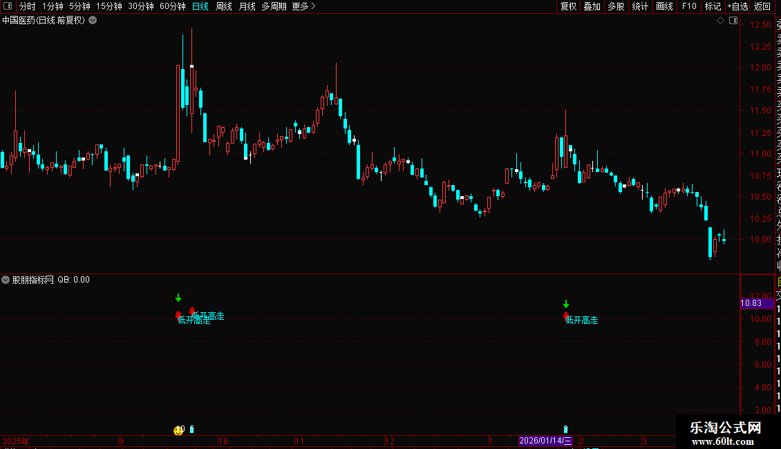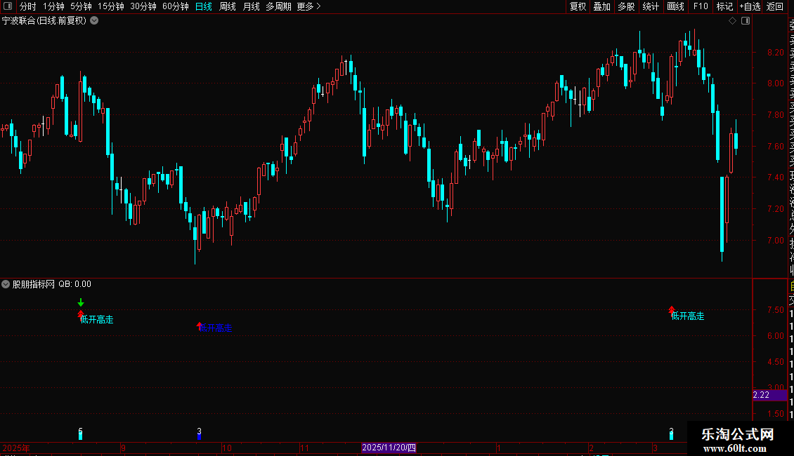 DRAWTEXT(QB AND 低开高走信号,L*0.90,'双信号'),COLORRED;
