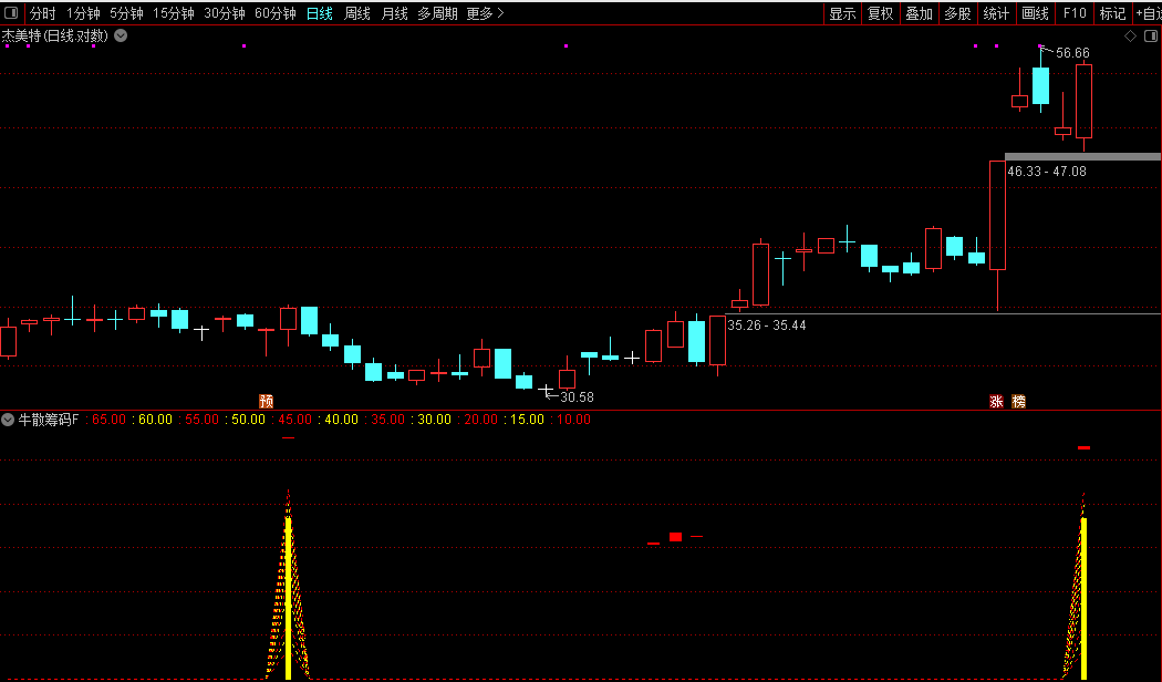 在操作策略上,当“牛散筹码”信号首次出现时,可视为潜在的底部启动或趋势加速点,适合轻仓试探。信号的可靠性可通过后续走势加以验证:若副图中出现红色柱体,表明趋势有所增强,可考虑适当加仓。该指标更适用于右侧交易的确认,不宜作为左侧抄底的依据。