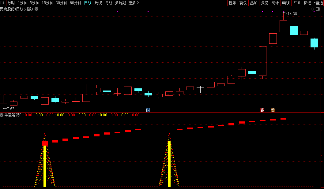 指标的核心在于一个特定信号:当中长期趋势指标与短期动能指标均转为强势,且中长期趋势指标刚刚上穿短期动能指标时,若当日股价收阳并伴随成交量放大,则定义为“牛散筹码”信号,并在副图中以醒目的柱状图进行标记。