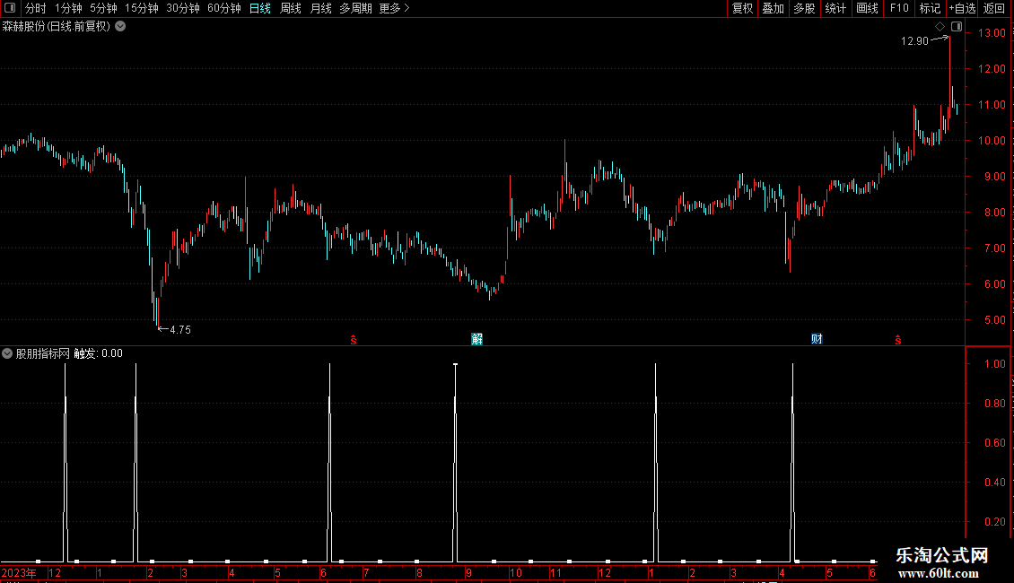 输出为“触发”信号,满足所有条件时标记为1。指标适用于趋势初期或回调后的再次启动阶段,常需结合其他分析手段综合判断。