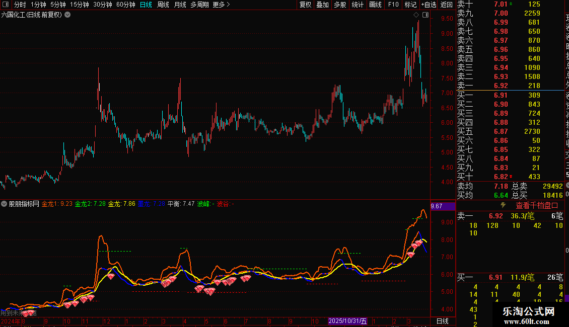- 墨龙:收盘价的LL日指数移动平均线,其上涨部分用不同颜色突出显示。