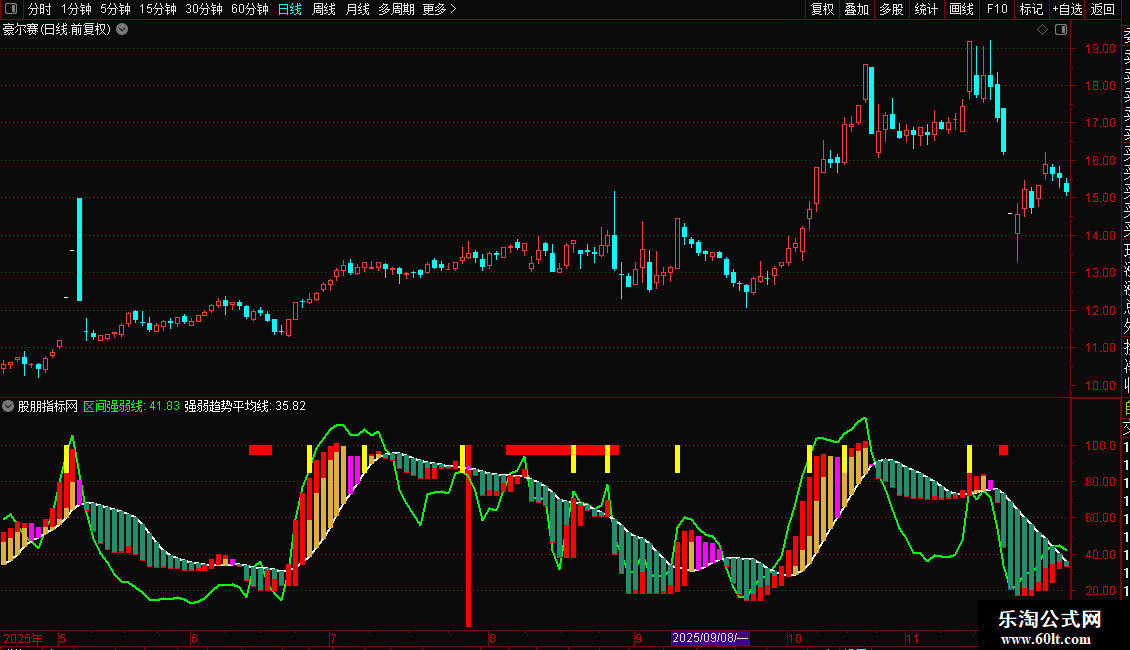 2、趋势确认:通过“区间强弱线”(绿色)与“强弱趋势平均线”(白色)的交叉及颜色变化,识别趋势强弱转折点;黄色柱状线标记5日内首次出现的高点突破信号。