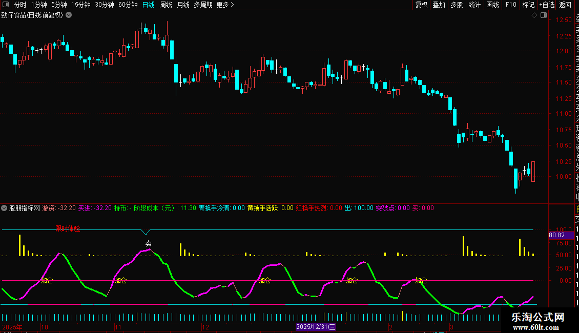 用法: 粉柱持股,蓝柱观望; 游资上扬(洋红粗线)买入,下穿(绿线)持币; “拐点”“加仓”“庄现!”提示关键机会,配合换手≥7%更有效; MM超80出“卖”字,警惕回调。