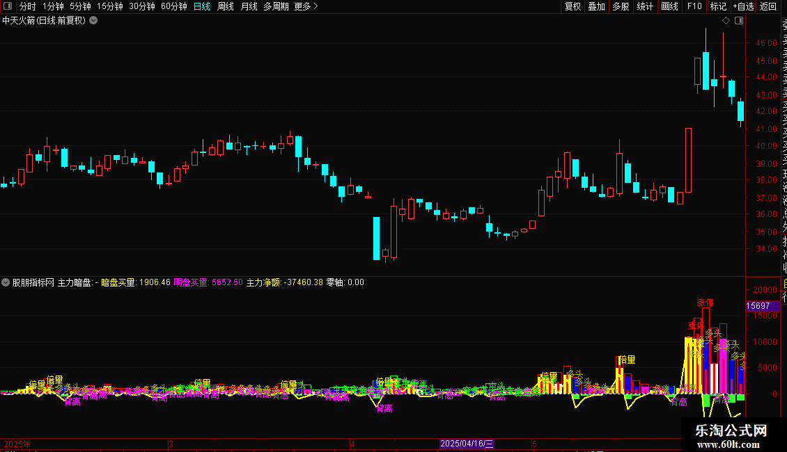 功能:指标的核心是将每日的成交量,根据开盘价、收盘价、最高价、最低价的关系,拆解为不同性质的“买盘”和“卖盘”,并用不同颜色的柱状图直观展示。同时,它还会在图上标注“倍量”、“涨停”、“背离”、“多头”等关键市场状态,帮助快速识别盘面特征。