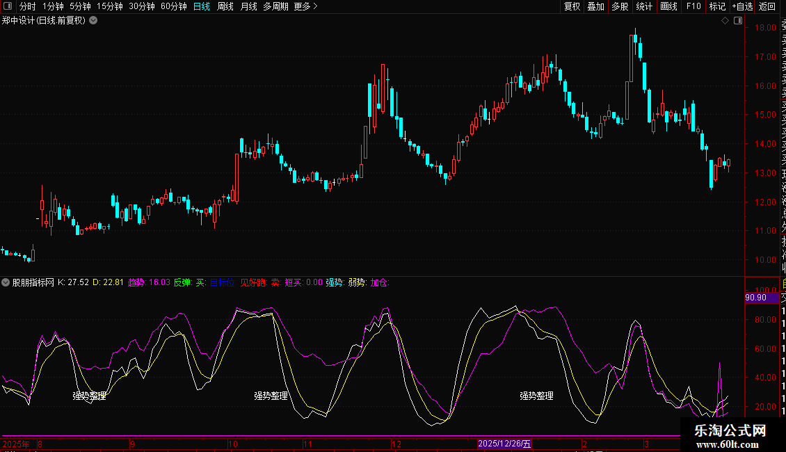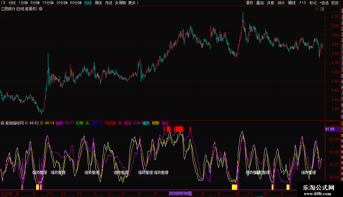 4. 辅助分析:包含类似KDJ的K、D线,以及“强势整理”等状态提示,用于辅助验证其他信号。