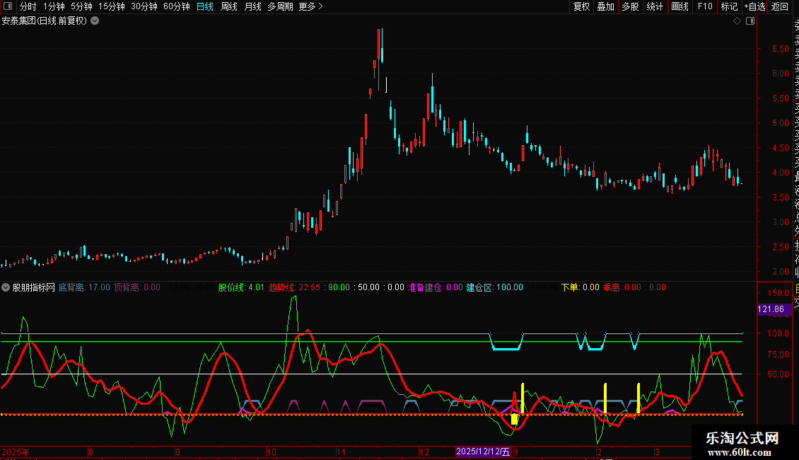 底背离:IF(MN< -4 ,17,0),COLORA67D3D,LINETHICK3;