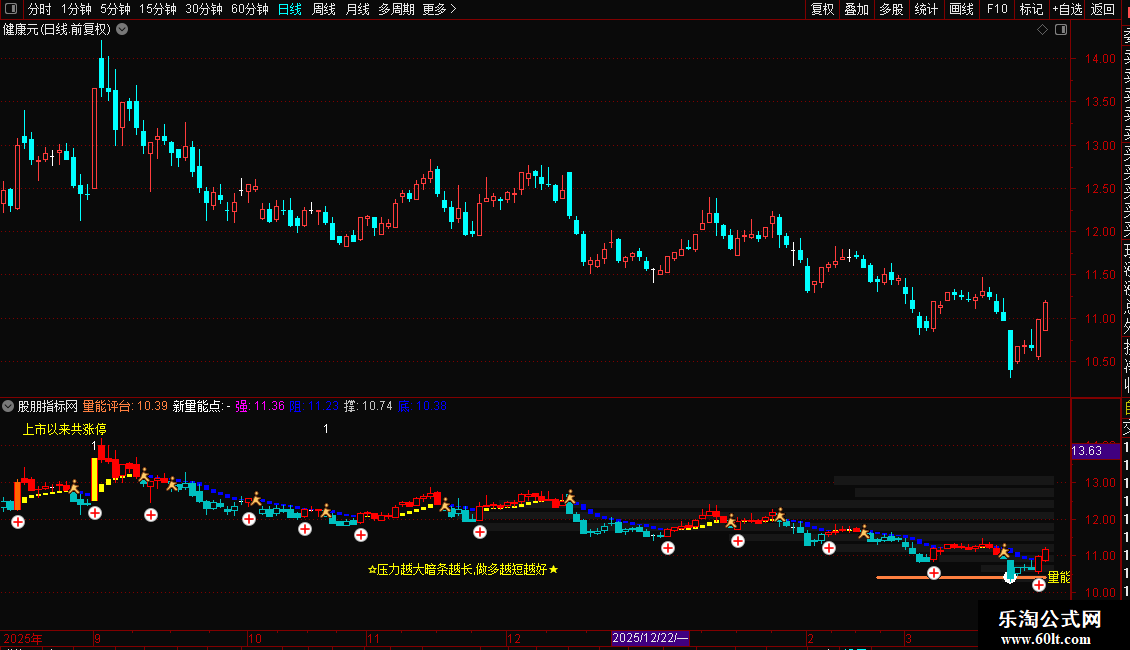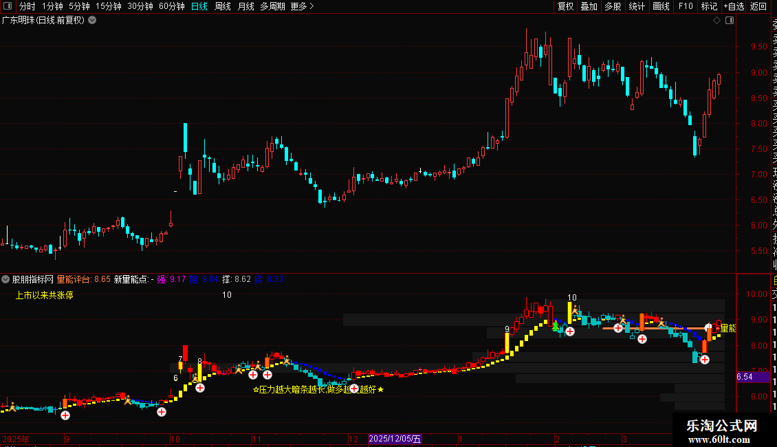 使用要点:指标综合了成交量分布、趋势方向、多空动能和关键价位,适用于分析个股的支撑阻力强度、短期多空态势以及异动点(如涨跌停)。观察时,重点关注成交量压力带的长度变化、量能平台与价格的互动关系,以及K线着色与多空区域的一致性。