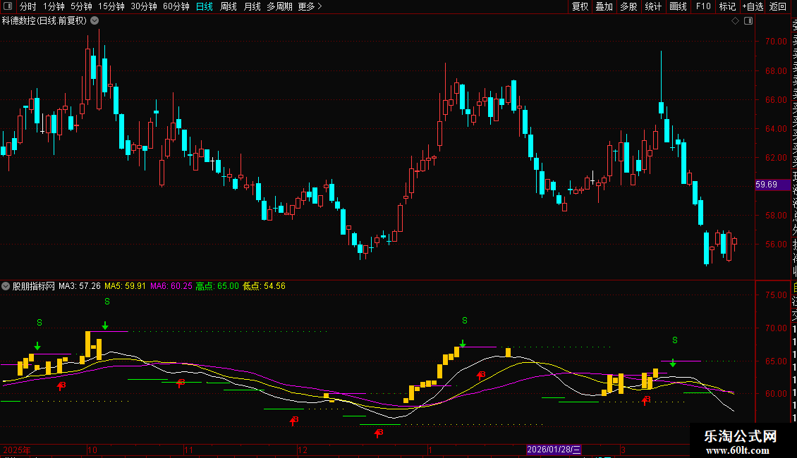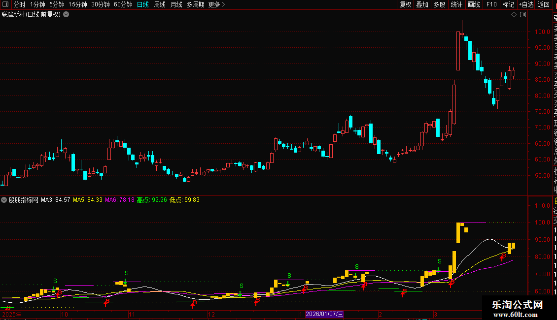 3. 卖出信号 (S):结合两种逻辑触发:一是“多头力量”显著强于“空头力量”且随机指标(KD)死叉;二是短期均线(3日)见顶回落且K值处于高位。在K线上方用绿色“S”字和图标标记。