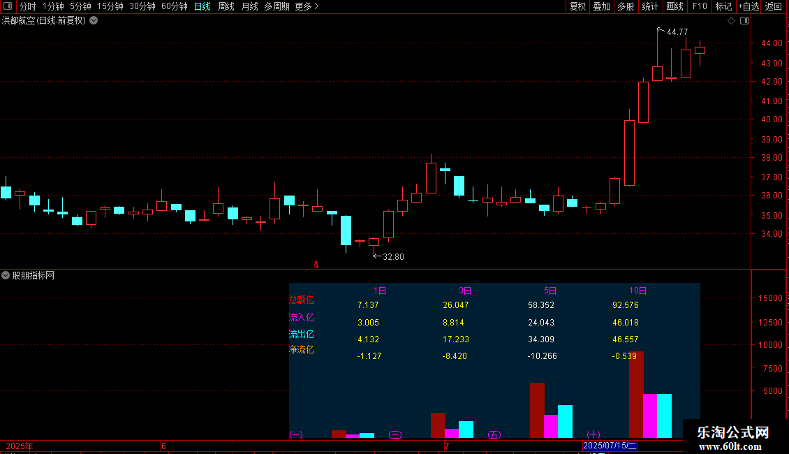 DRAWTEXT(CURRBARSCOUNT=30,画*0.67,'流出亿'),COLORCYAN;