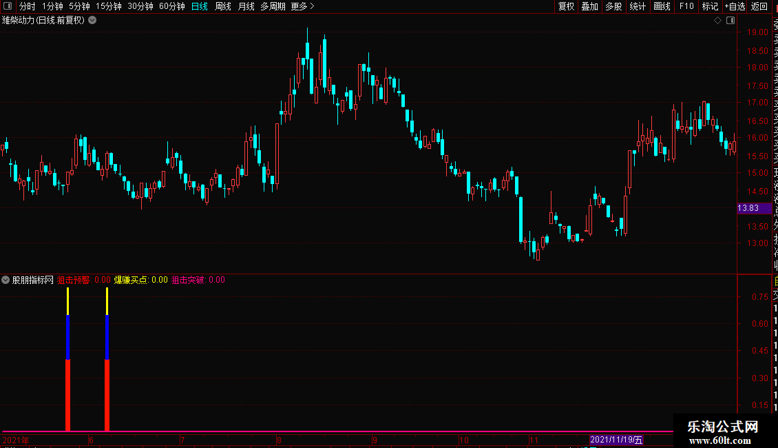 稳健买点:当副图中出现由蓝、黄等颜色组成的柱状线时,提示“爆赚买点”。这通常代表个股满足多重底部启动条件,是一个相对稳健的介入时机。